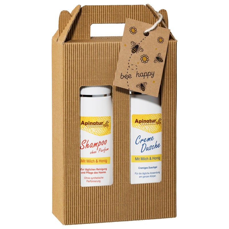 Geschenkkarton mit Schleife und Anhänger: gefüllt mit 1 x Apinatur Milch-Honig-Cremedusche und 1 x Apinatur Milch-Honig-Shampoo ohne Parfum sowie 1 x Seiftuch sonnengelb aus 100% Baumwolle. Andere Bestückungen der Milch-Honig-Produkte sind möglich. Bitte teilen Sie uns Ihre Wunschprodukte bei Bedarf mit.Milch-Honig-Cremedusche: